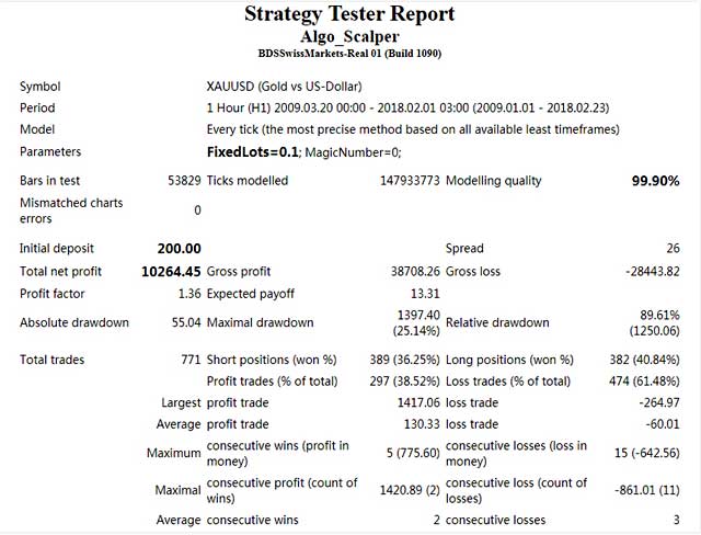 As for the trading results, the vendor provides us with a back test showing that the Algo Scalper EA is profitable from 2009, to late February 2018. Considering we are nearing the end of summer, it would be in the developer’s best interest to update their back test, so we know that it’s performing in current market conditions.