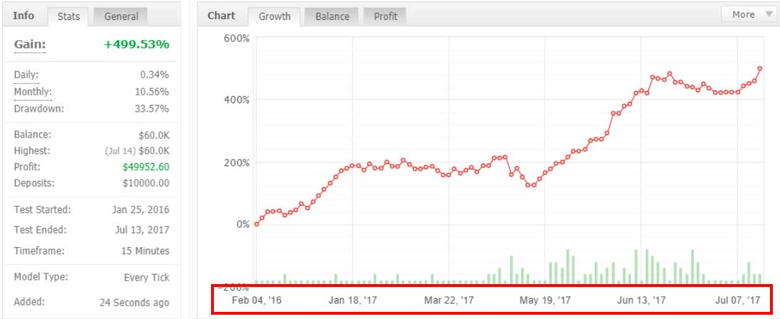 If you look at the main image, you can see that the software was trading from February 2016 to July 2017. During this time the EA gained almost 500%. The question I have now, is where has this account gone?