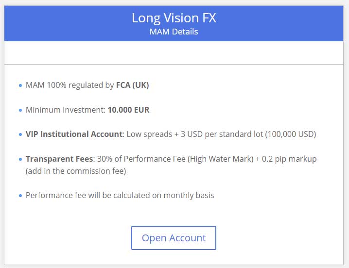 Unlike most of the systems that are review here at Forex Robot Nation, the Long Vision FX program is not an EA. This is a managed account that can be followed directly on Myfxbook, or accessed via the Fey Cox website. To become part of the MAM traders are required to deposit a significant amount of money, which makes this a riskier proposition.