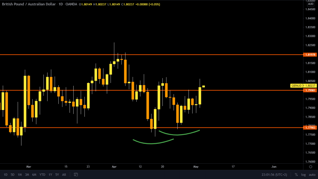 The price on the higher time frame was in a clear downtrend before posting a double bottom near the strong support around the 1.7790 USD level. The market changed direction and now it is trending to the upside.