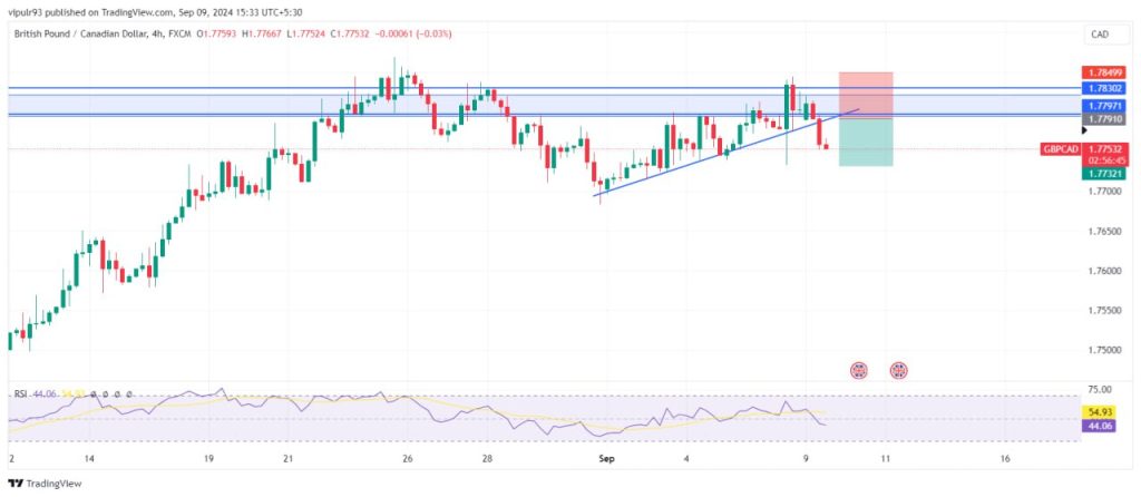 On the lower time frame, the pair is moving in the major trend’s direction. It faced resistance at a key level of 1.78302 and broke a trendline. As of now the pair has broken and retested a minor level of 1.77971 before continuing the momentum.