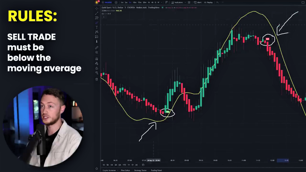 For our take profit, we simply close the trade when a candle closes on the other side of the moving average.