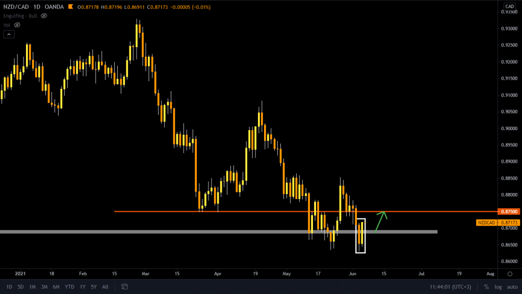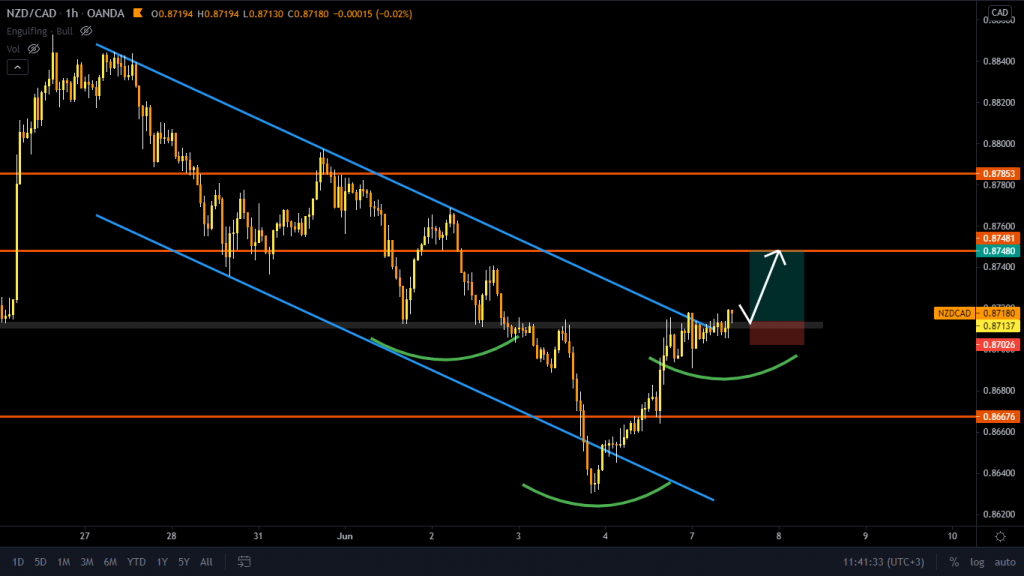 The price on the higher time frame posted an engulfing bullish pattern around the strong support (0.8667 USD), which might lead to a reversal from a downward movement to an upward one. Let’s see what’s happening on the lower time frame to spot an opportunity to buy.