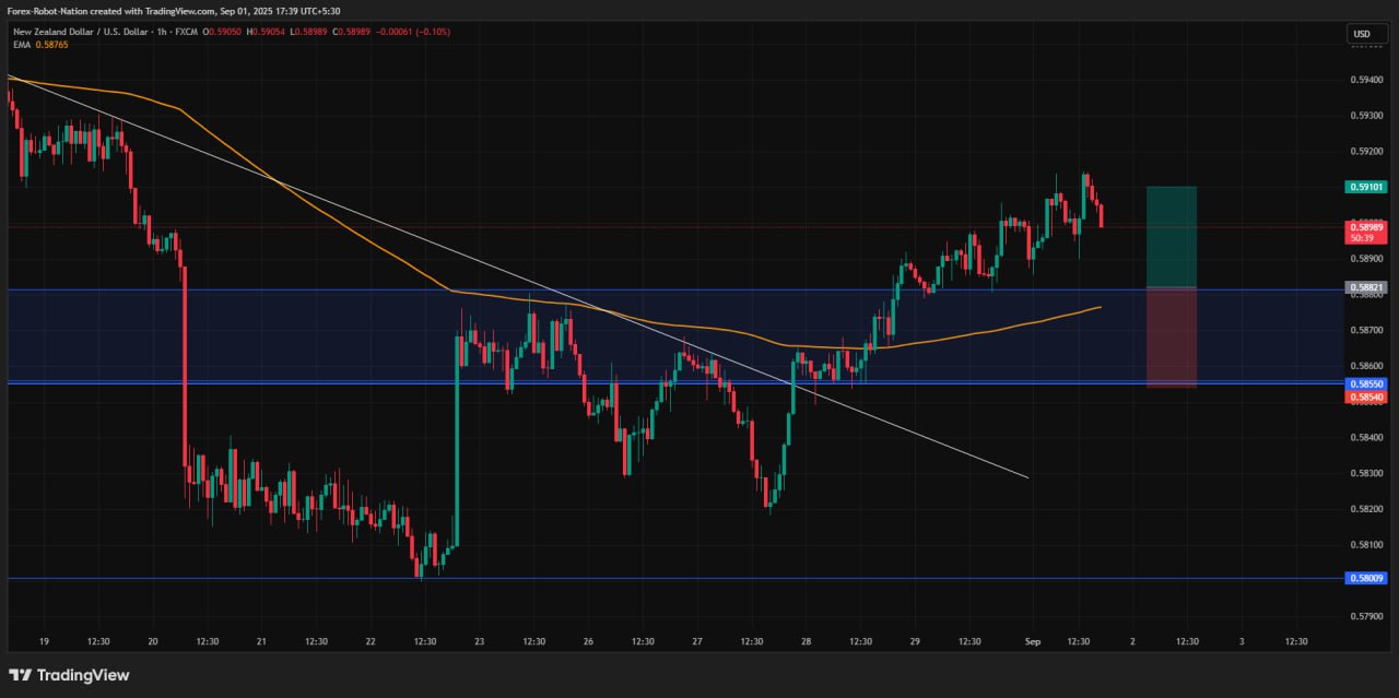 On the lower time frame, the pair is moving in the major trend’s direction. It broke a resistance area recently to shift the short-term trend to bullish. As of now the pair has broken and retested a minor level of 0.58550 before continuing the momentum.