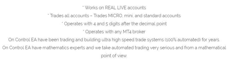 Despite the exorbitant price tag, the On Control EA website provides us with very little information about the trading system, and how it works. When dealing with the system going for thousands of dollars, I expect much more detail in terms of strategy, then the normal EA going for just a couple hundred dollars. In this case, we are told that the software works on all trading accounts, with any MT4 brokerage and that the strategy was developed by mathematical experts, that come from a mathematical point of view. This really doesn’t tell us anything.