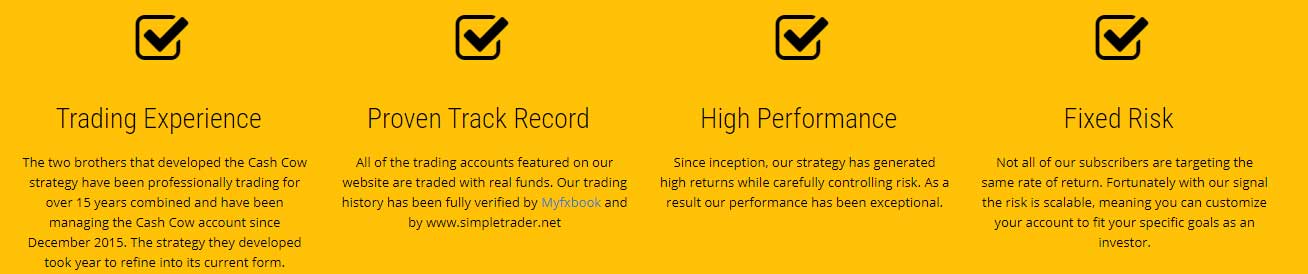 The creators of Cash Cow Signal believe that due to the steep learning curve of the Forex trading market, signal services do an excellent job filling the gaps. They want traders to be aware that they don’t have to change brokers, or give anyone else control of their trading account, they can simply “copy the trades of a master trader.” All traders have to do is install a program that will automatically copy the trades onto your trading account.