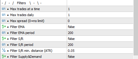 Here you can set the max trades at one time, and max trades per day. As well as make the robot only BUY if it’s in an up trend, and only SELL if it’s in a down trend by specifying the EMA period. You can also set up S/R which is support & resistance levels.