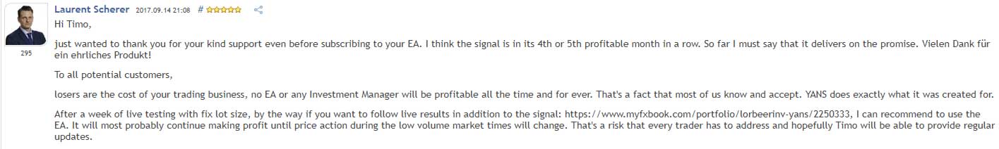 There are currently 16 reviews available for the Yet Another Night Scalper robot. Out of this 16 reviews, there are ten 5 star reviews, four 1 star reviews and one no rating. 2 of the negative reviews have come in the past 3 days, which I can’t say I’m surprised with.