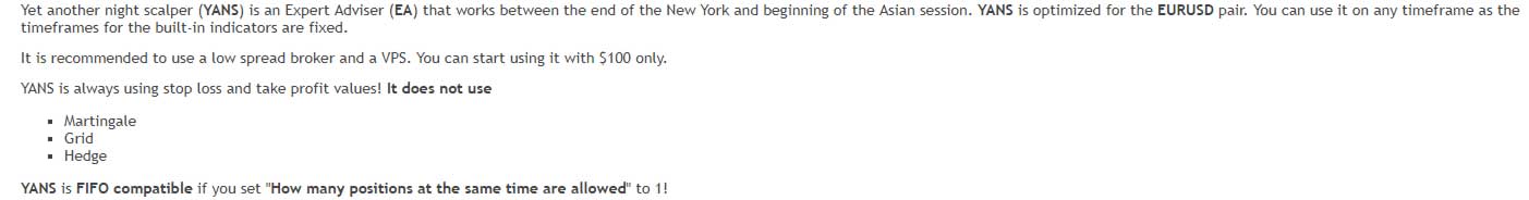Today I’m looking at a new Forex robot is being sold on the MQL5 marketplace, YANS, or Yet Another Night Scalper. The name of the software sums up the type of trading system that it is. This robot “works between the end of the New York and beginning of the Asian session,” when the market is ranging and scalpers have a high probability of winning trades.